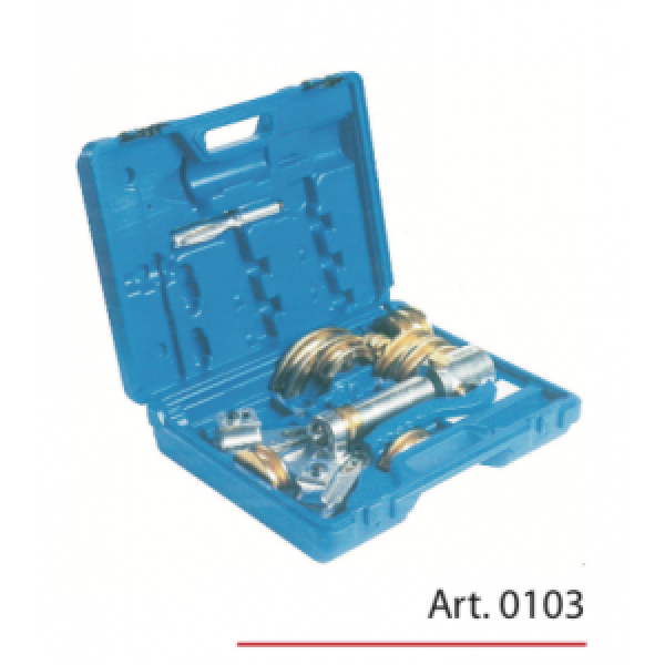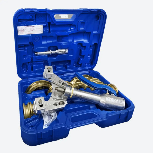 Balení obsahuje: Hydraulickou ohýbačku; prodloužení pístu, mosazné ohýbací segmenty (4,5,6-8-10-12-14-15-16-18-20-22) plastový kufr
