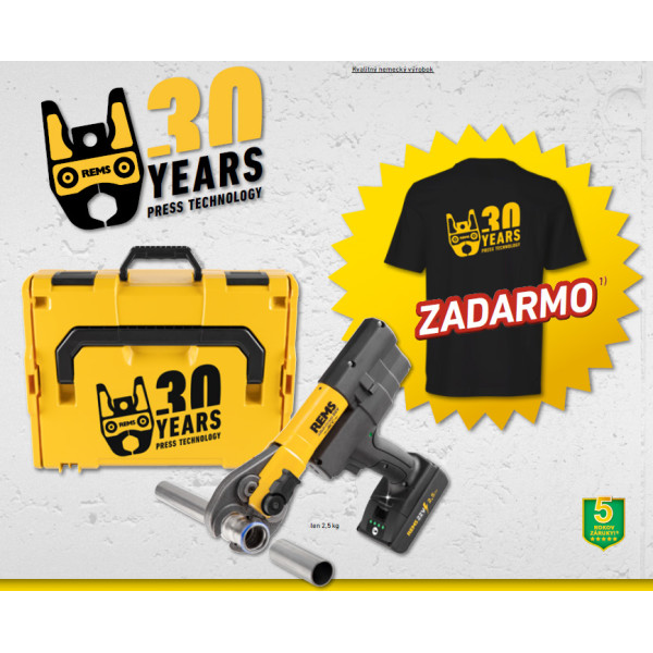 Akční balení obsahuje: Akumulátorový radiální lis Mini Press 22V ACC; Akumulátor Li-Ion 21,6V, 1,5 Ah; Rychlonabíječku Li-Ion 230 V, 50–60 Hz, 70 W; Kufr L-BOXX + dárek REMS tričko – 30 let lisovací technologie